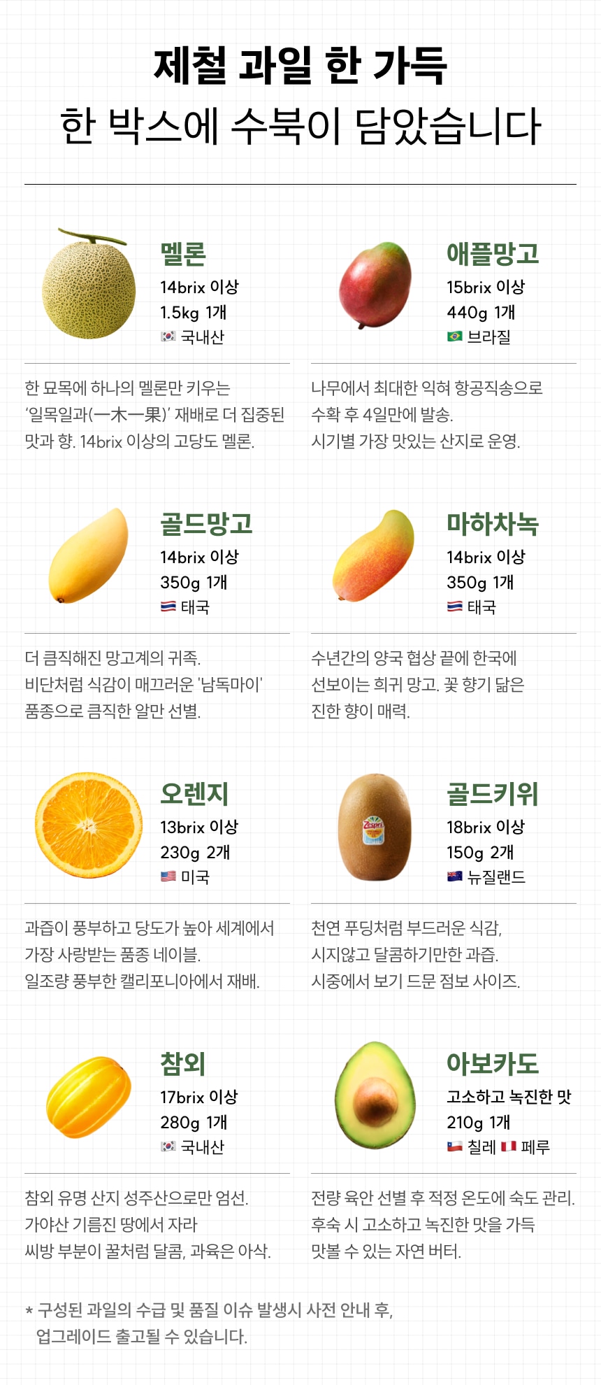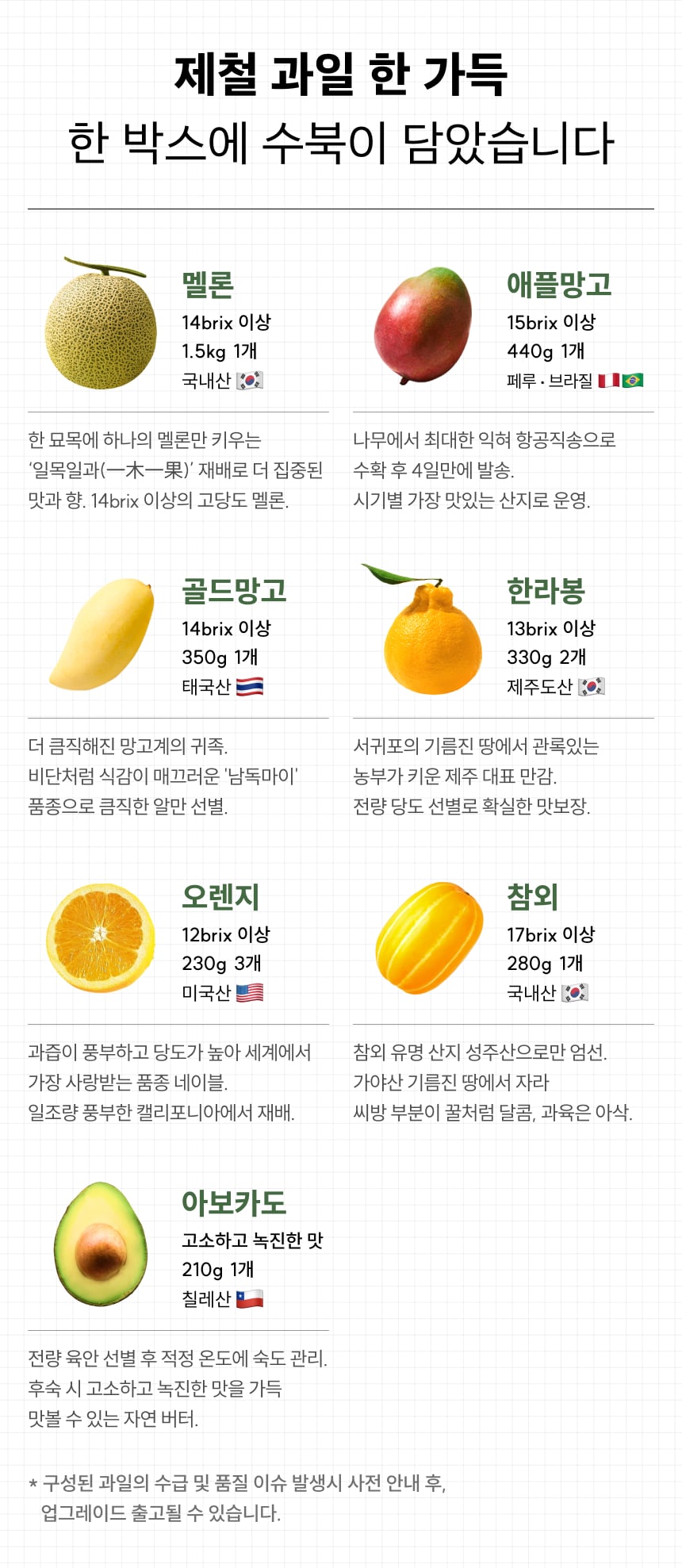 제조연원일/유통기한 | 수입과일 제조연월일 : 포장 전 2일 이내 통관 상품 / 국내산 과일 : 상시수확 / 유통기한 : 신선식품으로 별도의 유통기한이 없습니다. 빠른섭취 부탁드립니다. |