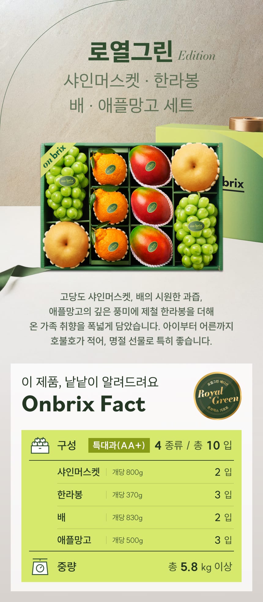 로열그린 에디션, 샤인머스켓&한라봉&배&애플망고 선물세트 5.8kg이상(10입/특품)