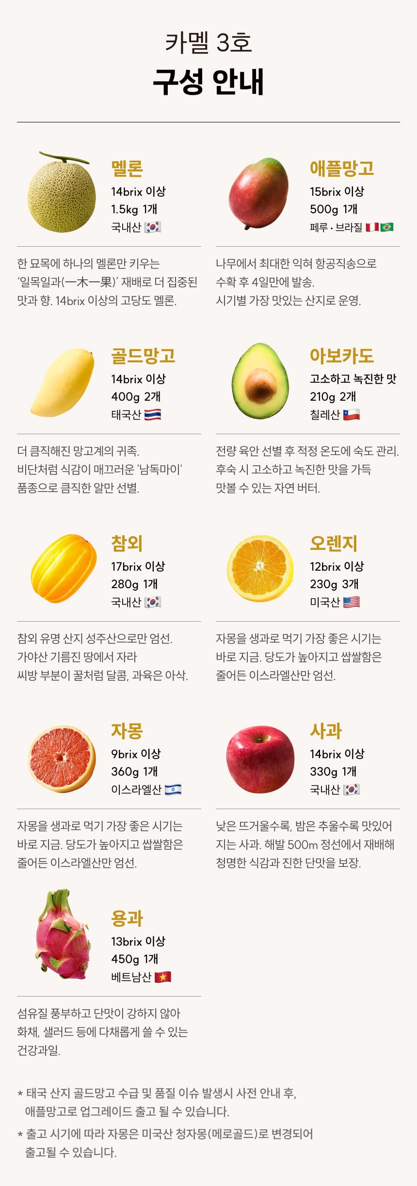 제조연원일/유통기한 | 수입과일 제조연월일 : 포장 전 2일 이내 통관 상품 / 국내산 과일 : 상시수확 / 유통기한 : 신선식품으로 별도의 유통기한이 없습니다. 빠른섭취 부탁드립니다. |