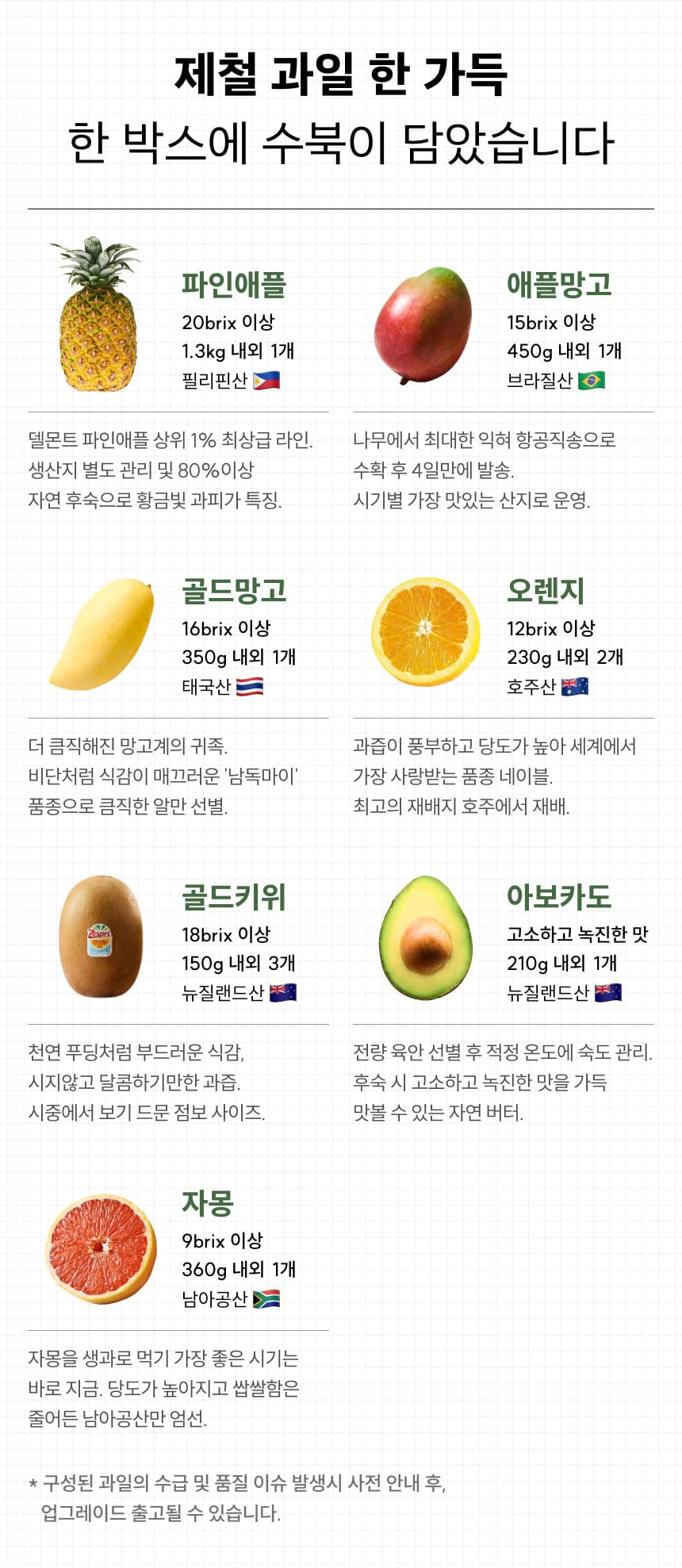 태국 산지 골드망고 수급 이슈로 인하여 사전 안내 후, 애플망고로 업그레이드하여 대체 출고될 수 있습니다.