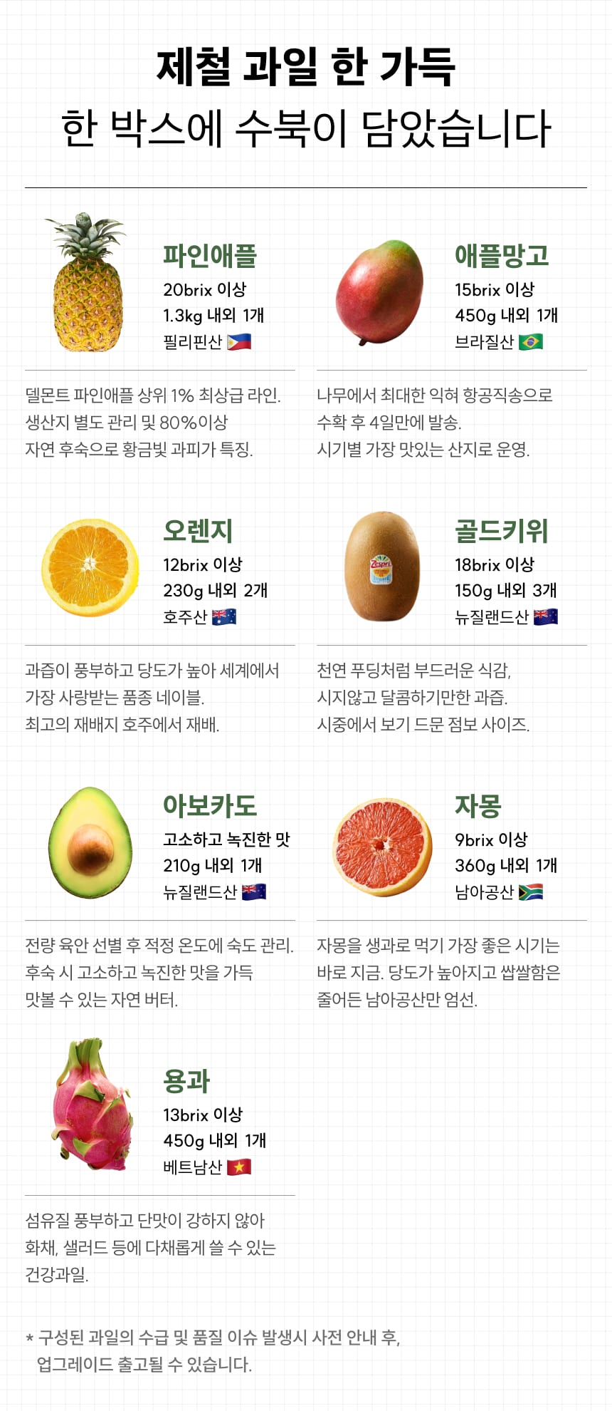 태국 산지 골드망고 수급 이슈로 인하여 사전 안내 후, 애플망고로 업그레이드하여 대체 출고될 수 있습니다.