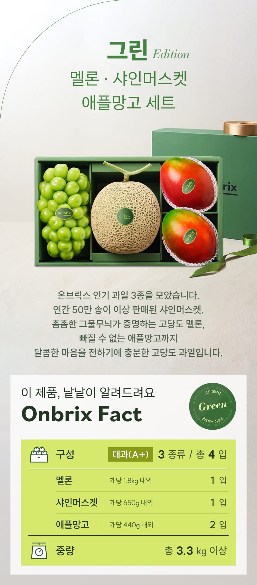 [새벽에On] 그린 에디션, 샤인머스켓&멜론&애플망고 선물세트 3.3kg이상(4입/특품)