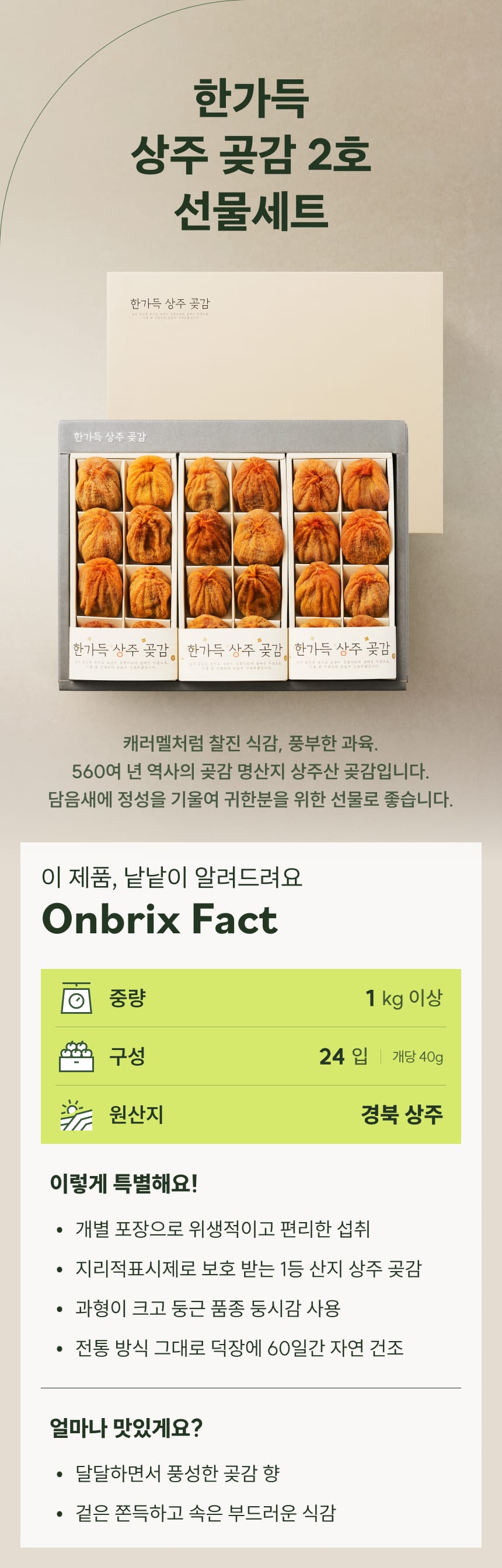 선물용으로 구매하면서 저희 집에도 곶감 킬러있어서 하나 더 같이 구매했습니다! 이정도 퀄리티에 상품이면 선물하고 절대 욕먹을 일 없어요! 곶감하면 일단 상주곶감 모르는 사람없죠! 저도 이거 매년 몇개씩 구매해서 어르신들 선물로 전달하고있는데 진짜 어르신들중에 곶감 싫어하시는 분들 많이 못봤어요! 최고에요!~