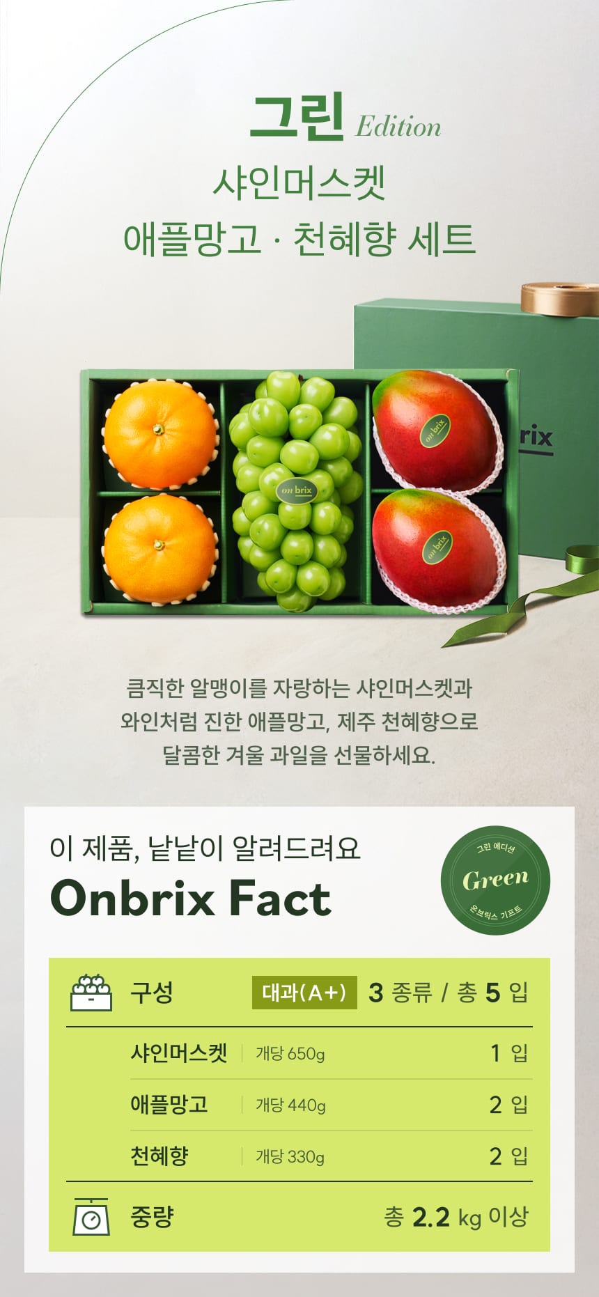 124 [설 선물] 그린 에디션, 프리미엄 샤인머스켓&애플망고&천혜향 선물세트 2.2kg이상(5입)